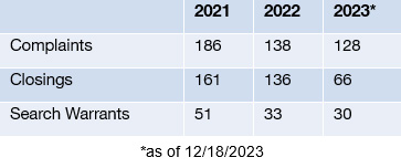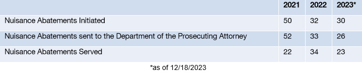 These partnerships and efforts have resulted in the closing of over 360 complaints, execution of nearly 115 search warrants, and service of almost 80 Nuisance Abatements over the past three years.